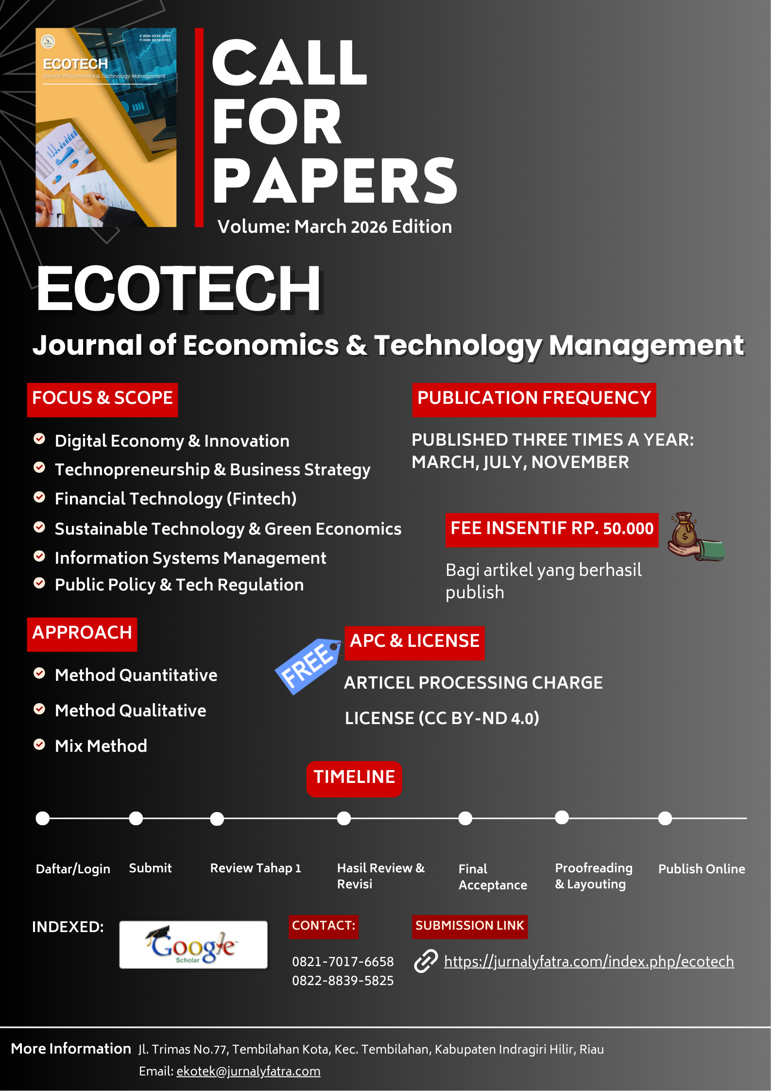 ECOTECH: Journal of Economics & Technology Management invites researchers, academicians, and practitioners to submit their original research for our inaugural issue. We are looking for high-quality papers that explore the intersection of economic principles and technological advancement.